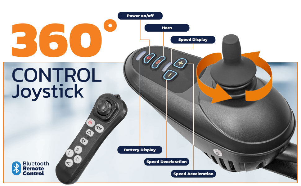 Navigate with ease using the 360-degree joystick, allowing users to move smoothly and precisely in any direction, even in tight spaces. The ergonomic design ensures a comfortable and personalized experience.