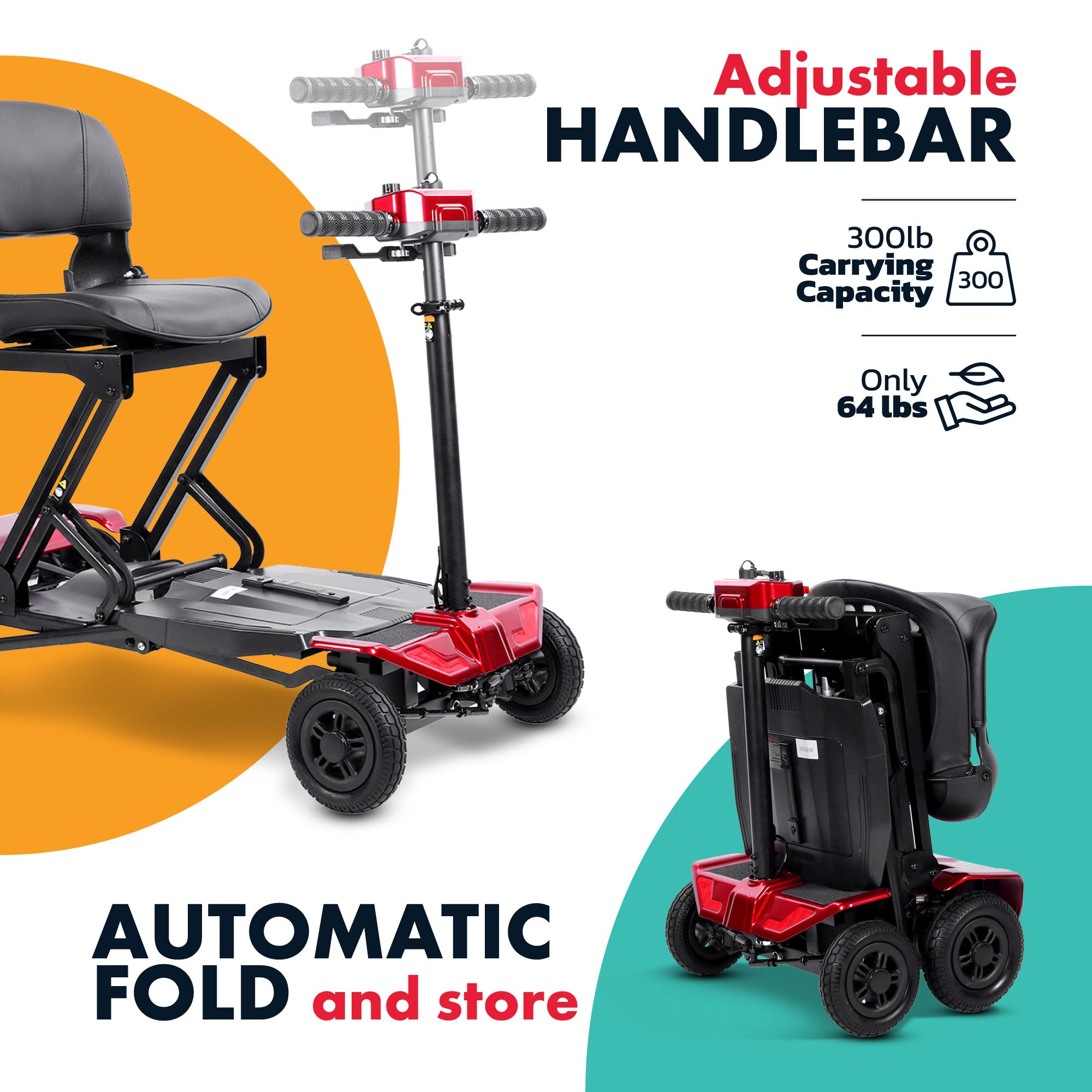 • Weighs only 65 lbs, making it one of the lightest 4-wheel mobility scooters available.